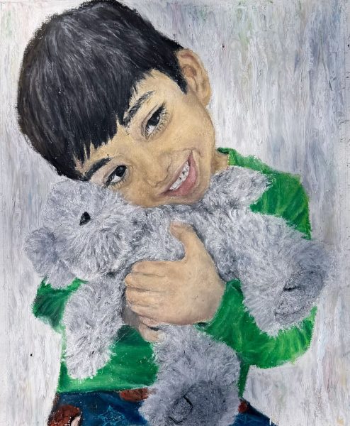 Another piece she made shows a smiling child holding a stuffed animal. The painting shows emotions through the child’s facial expression while also focusing on details such as the stuffed animal and the clothing. This shows that she can paint realism and personality.