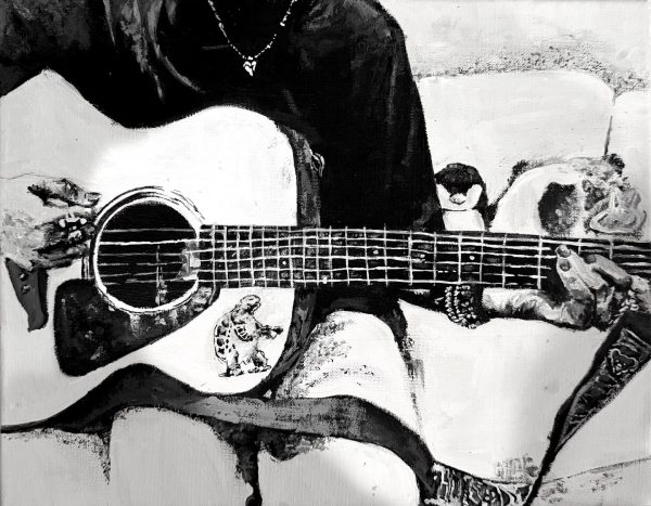 The last piece with a person holding a guitar shows the amount of contrast she used. It is in black and white, and the attention to all the details is amazing. By using shading and contrast, Abraham created depth in the drawing and made it look more realistic.