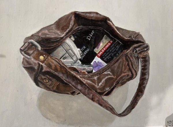 One of the pieces she made shows a bag opened, revealing the stuff inside it. The drawing shows her ability to work with color and light, bringing the bag to life with shadows and highlights.